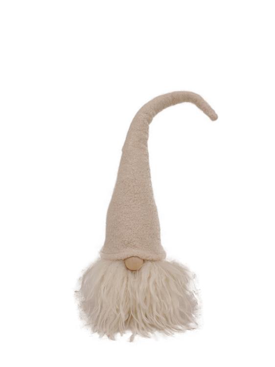 Festlig tomtenisse där endast näsan sticker fram från den cremefärgade luvan. Stort vitt lockigt skägg och hög luva.