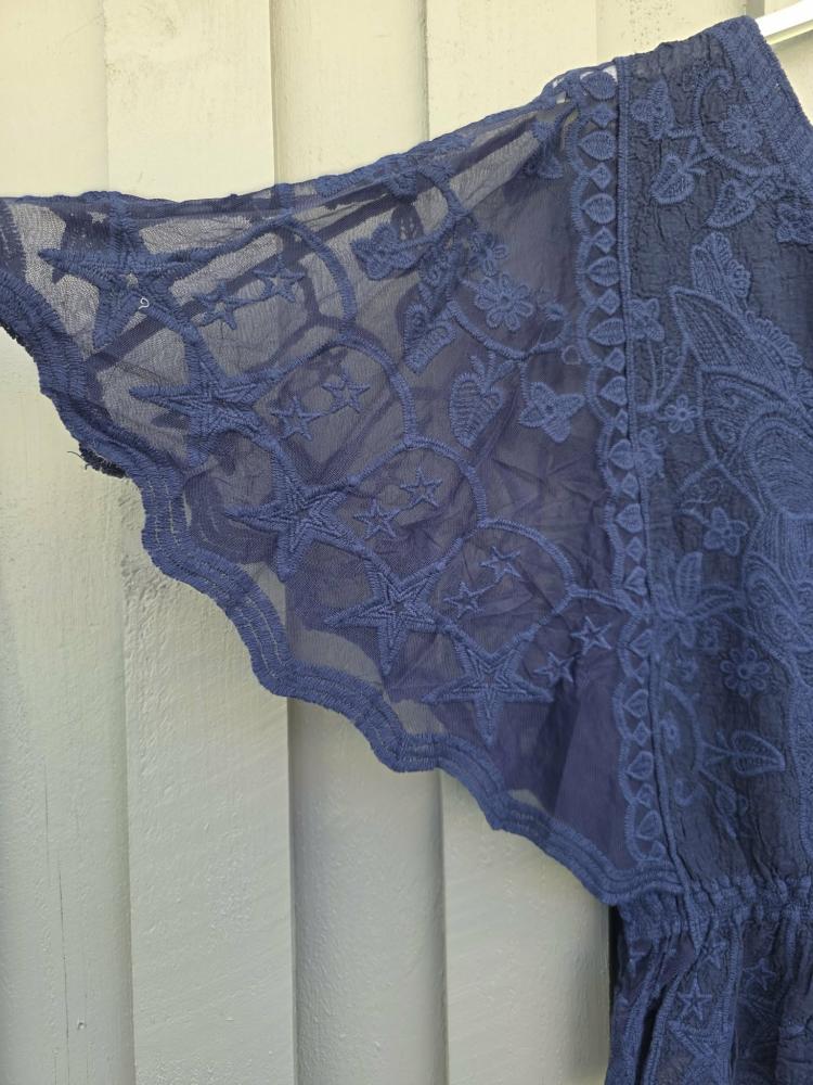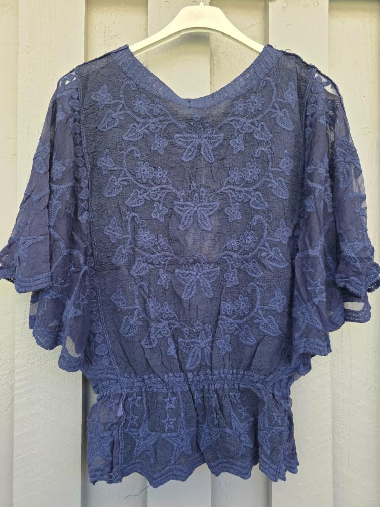 Vacker mörkt blå spetstopp med vid fjärilsärm, motiv av fjäril fram och resår en bit nerifrån - Dubbelstorlek