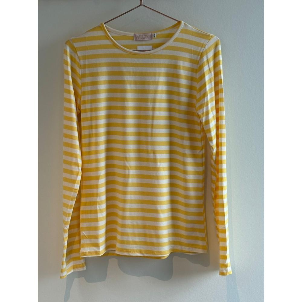 Tunn, skön topp i smalrandigt; gult och vitt. Perfekt att ha under en stickad väst, kofta, tröja - eller bär den som den är till ett par snygga jeans.