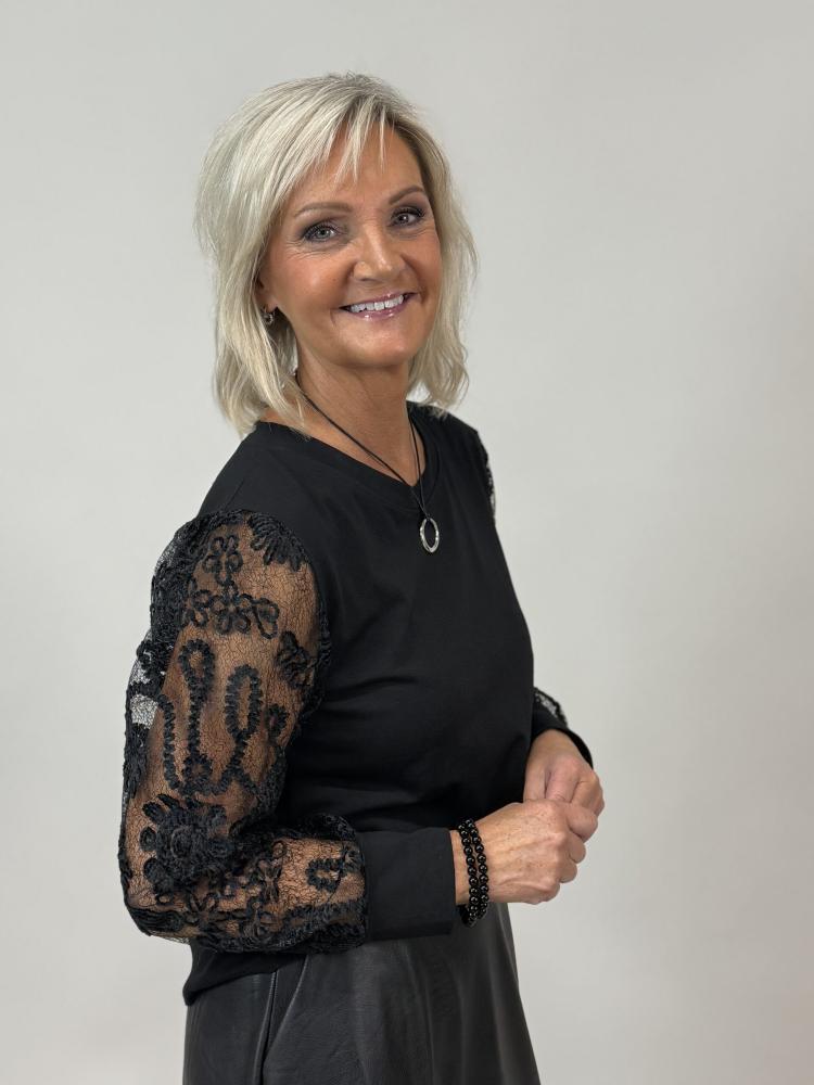 Yvette är en elegant topp som kombinerar komfort och finess. De genombrutna spetsärmarna ger en lyxig känsla och skapar en vacker kontrast mot den mjuka trikån. En perfekt topp för både vardag och fest – lika fin till kjol som till ett par dressade byxor.