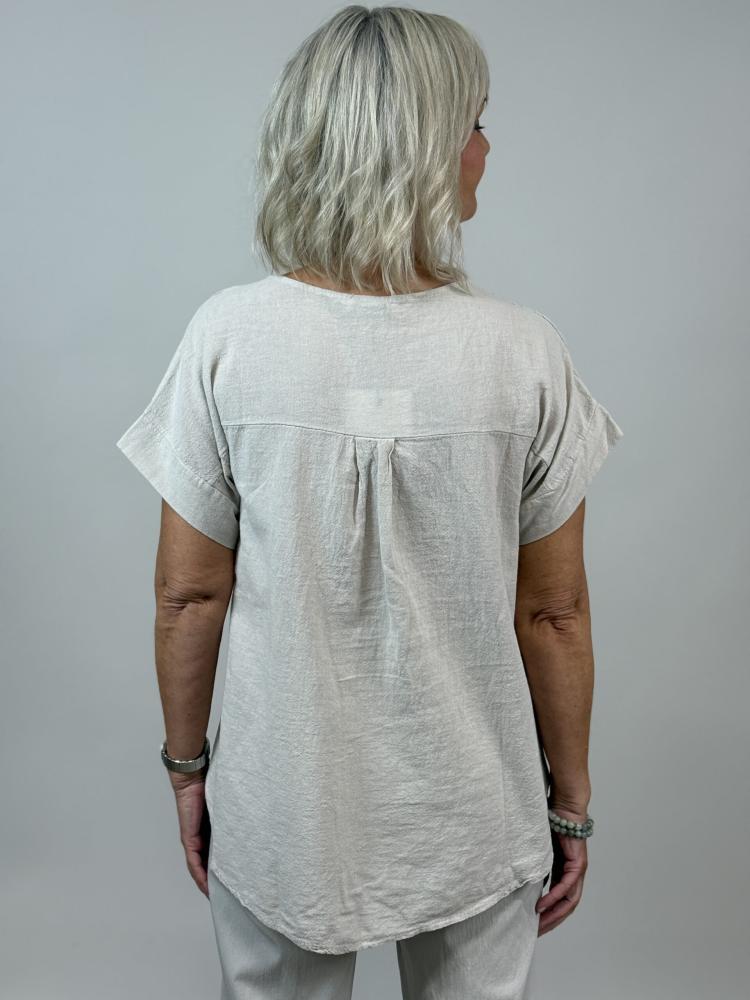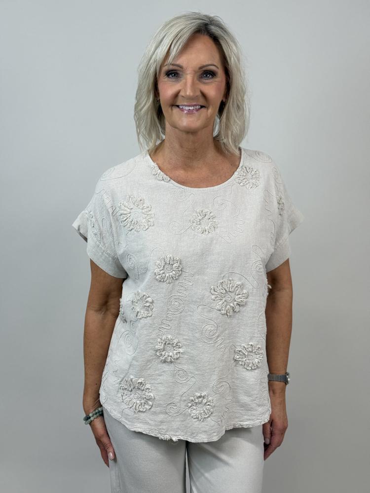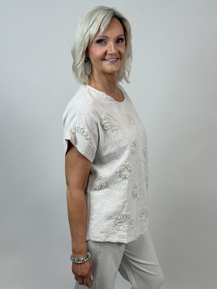 Söt beige rundhalsad bomullstopp med brodyr och påsydda applikationer i samma färg. Kort ärm samt motveck bak för fin passform.