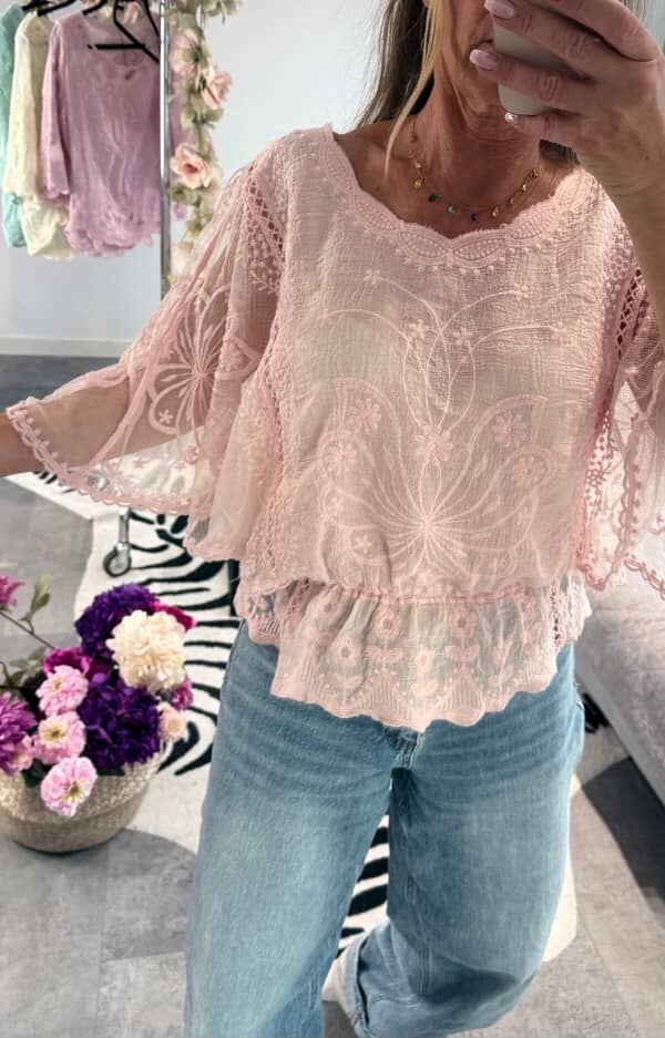 Topp med spets och brodyr, Fjärilsärm Rosa, Grace - Love Forever