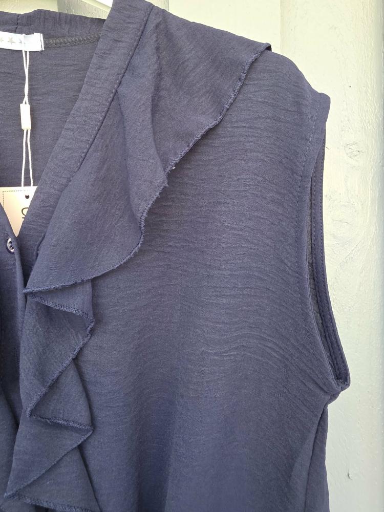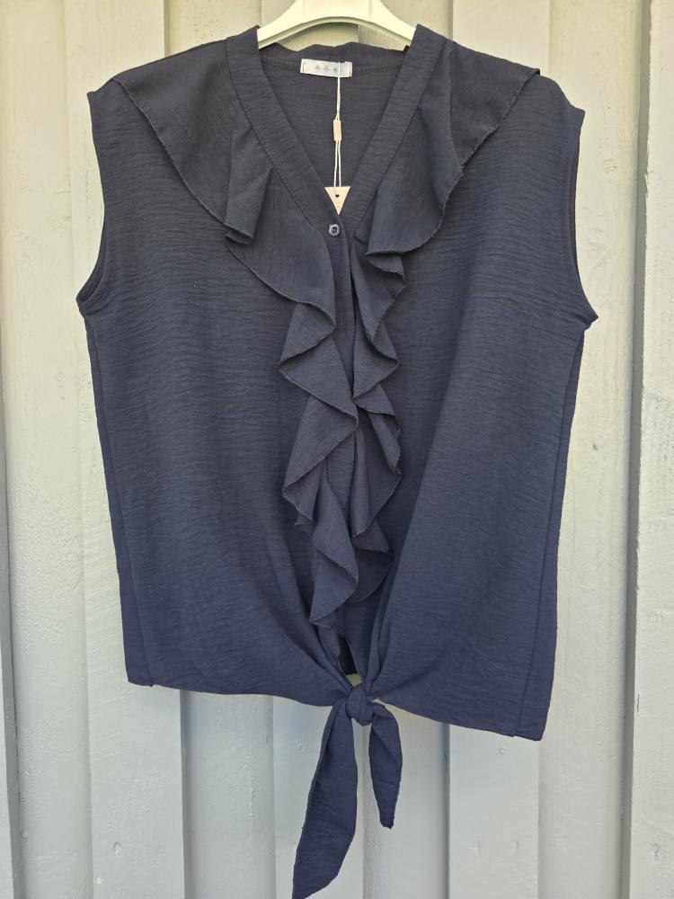 Snygg topp i en fin mörkblå kulör. Luftig modell utan ärm, med knäppning hela vägen fram samt en volang som når ner till knytbanden i nedankanten.
