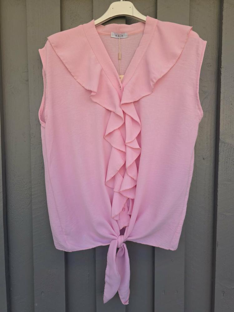 Snygg topp i en fin rosa kulör. Luftig modell utan ärm, med knäppning hela vägen fram samt en volang som når ner till knytbanden i nedankanten.
