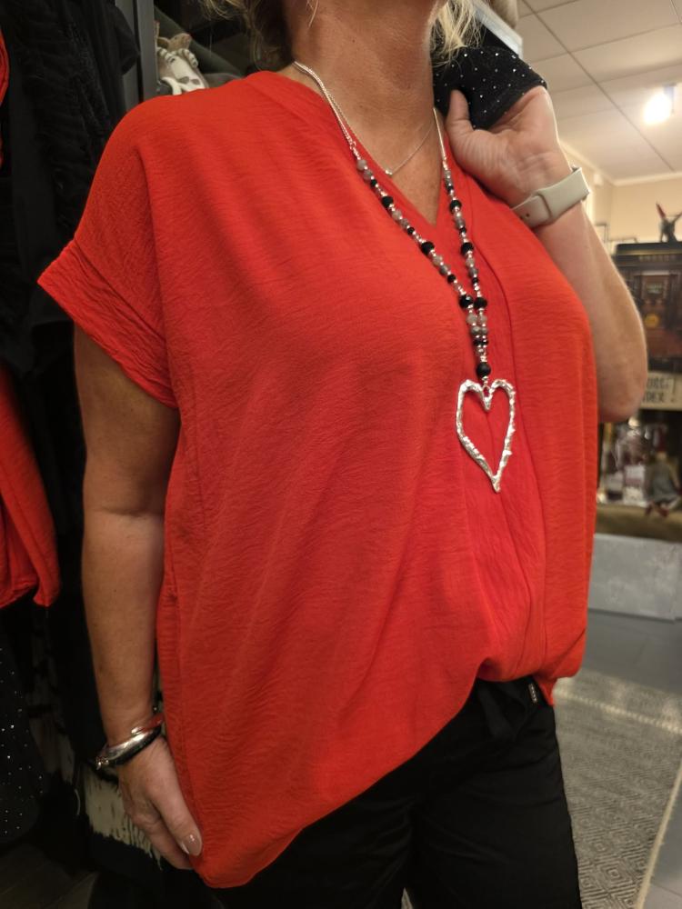 Röd v-ringad blus med kort ärm. Trevlig detalj med sömmen rund halsen, som följer hela vägen ner.