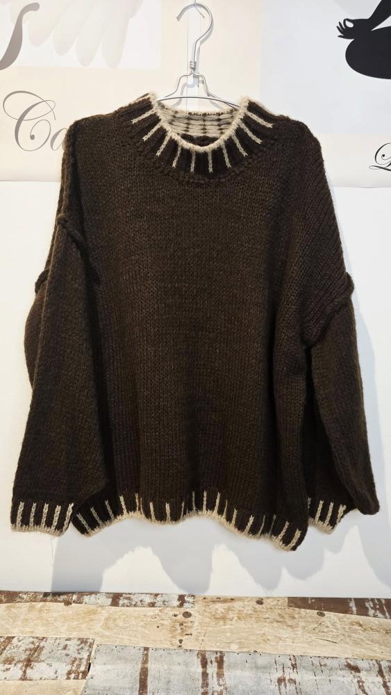 En lite tuffare brun stickad tröja med utanpå söm vid ärmen. Detaljen med stickningar i bl a halsen gör hela tröjan!
