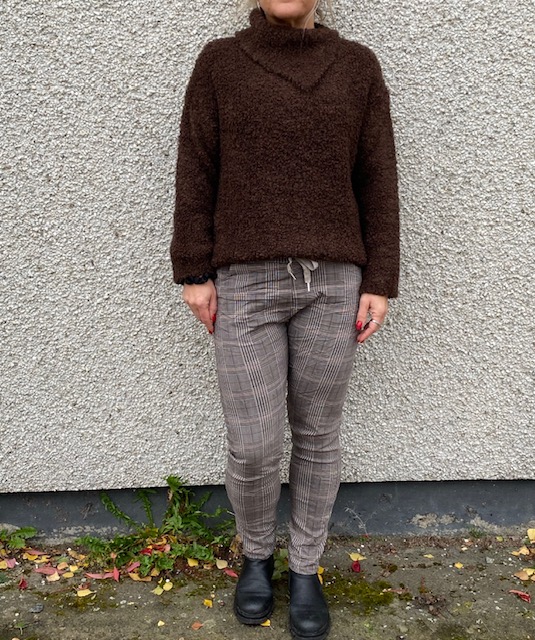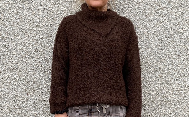 Stickad tröja i en snygg brun ton samt med en dekorativ krage. Härligt fluffig i kvalitén och väldigt mjuk och skön.