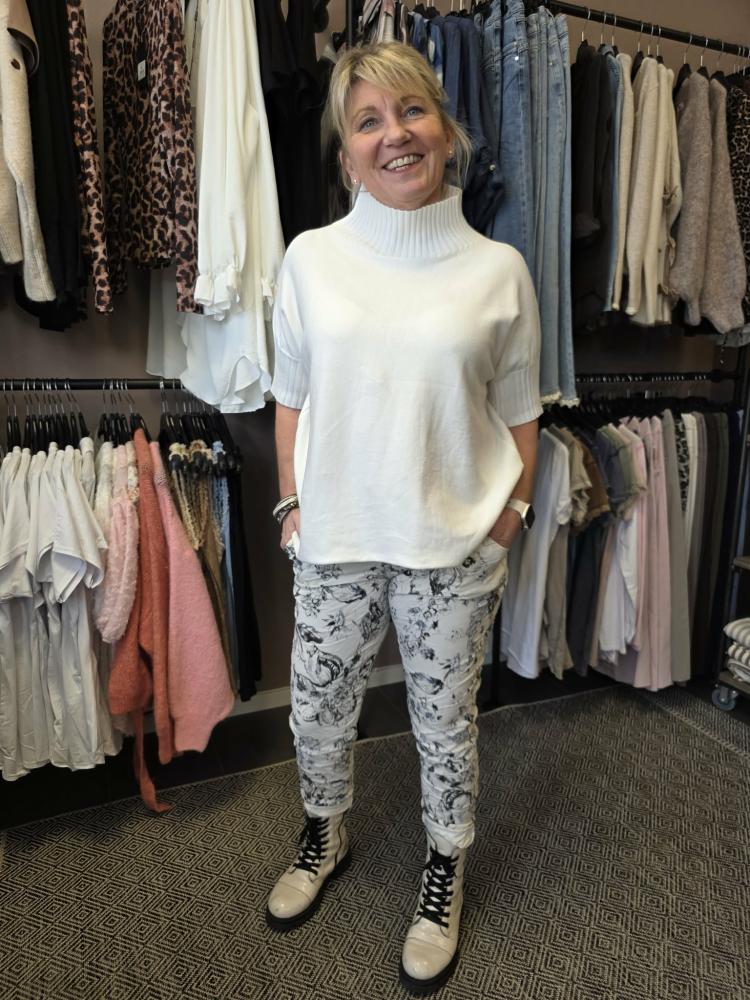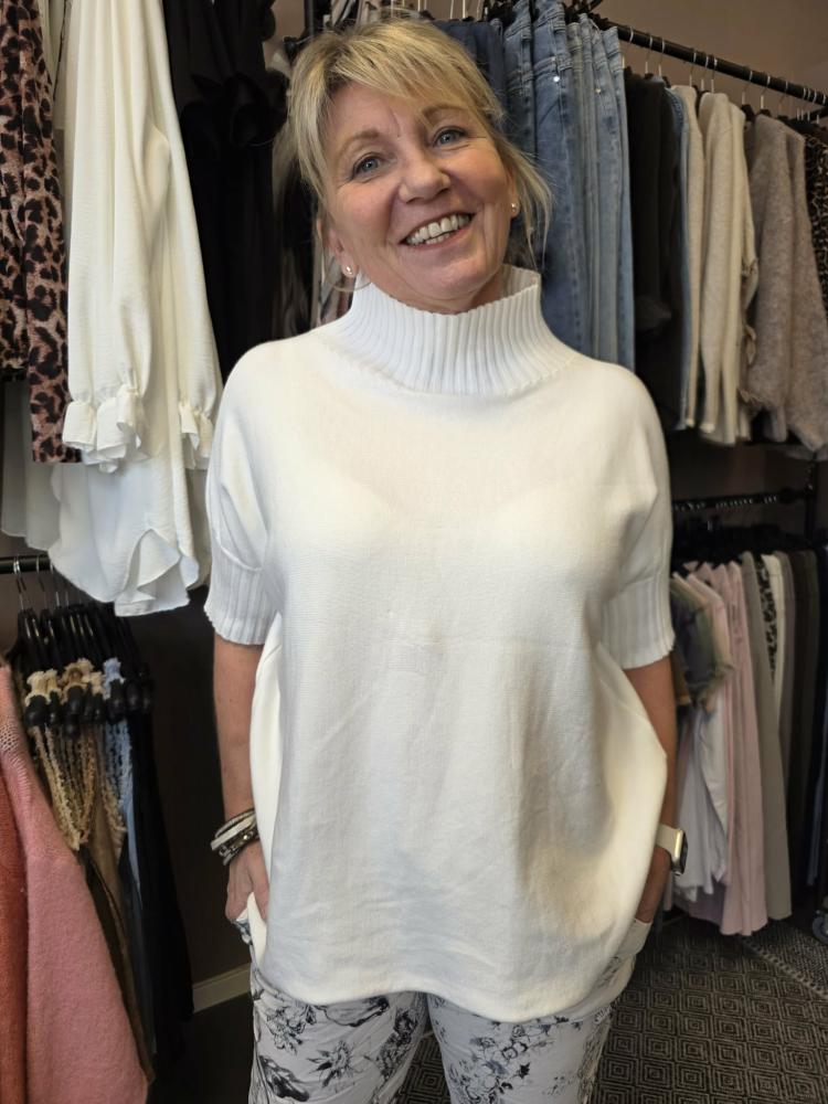 Skön tröja med halvpolo, i trendigaste creme. En mycket mjuk och skön tröja / topp i en lite vidare modell.