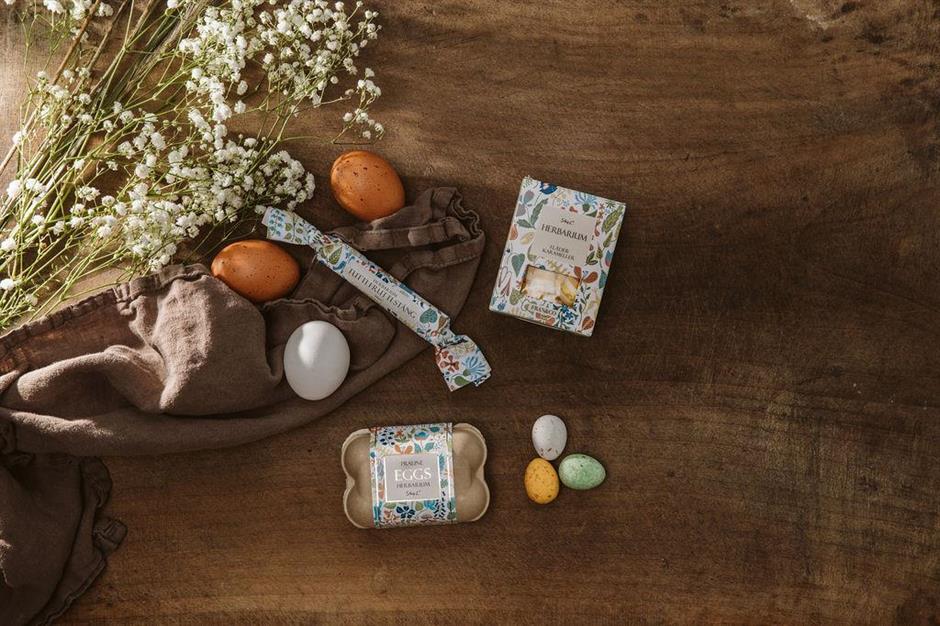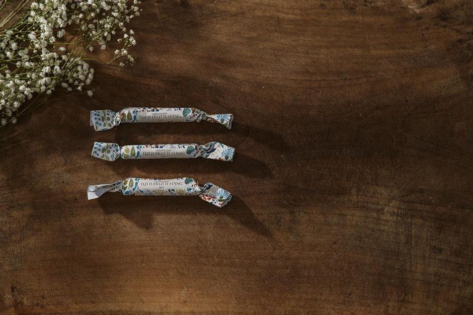 Härligt vackert inslagen stång med fruktsmak; Tutti Frutti. Omslaget är ett av Stig Lindbergs mest välkända mönster; Herbarium.