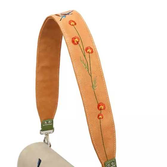 Den korta broderade remmen är en riktig detalj i sig, med vackra blommor och en fågel som ger väskan ett unikt och hantverksmässigt uttryck. På framsidan möts du av två söta blåmesar som sitter på en gren – en liten detalj som verkligen gör hela väskan levande och personlig.