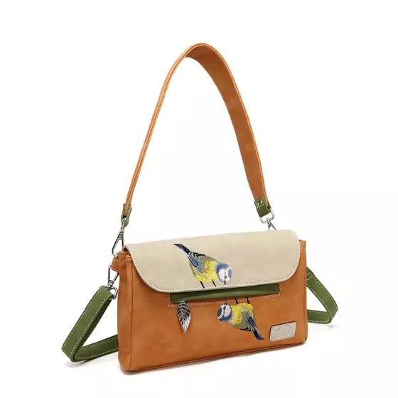 En charmig och mångsidig väska i orange och beige med broderade blåmesar som blir en riktig blickfångare. Kan bäras både som axelremsväska och clutch – perfekt när du vill variera din stil.