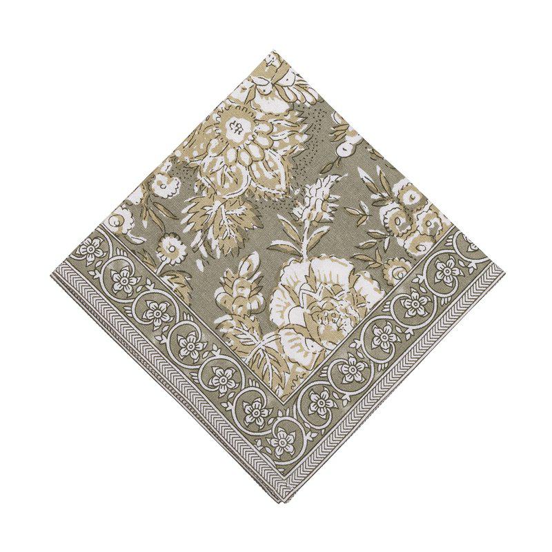 Servett i bomull med ett magnifikt blommönster och festlig randig bård längs sidorna. Kan även användas som liten duk.