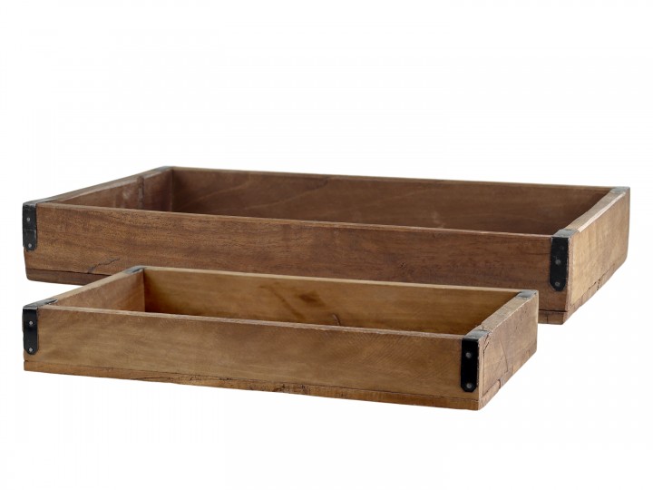 Trälådan är tillverkad av återvunnet trä, vilket ger den en naturligt åldrad och sliten yta. Metallbeslagen är detaljer som förstärker lådans rustika utseende och hållbarhet. Eftersom varje låda är tillverkad av återvunnet material kan storlek och träslag variera, vilket gör varje exemplar unikt.