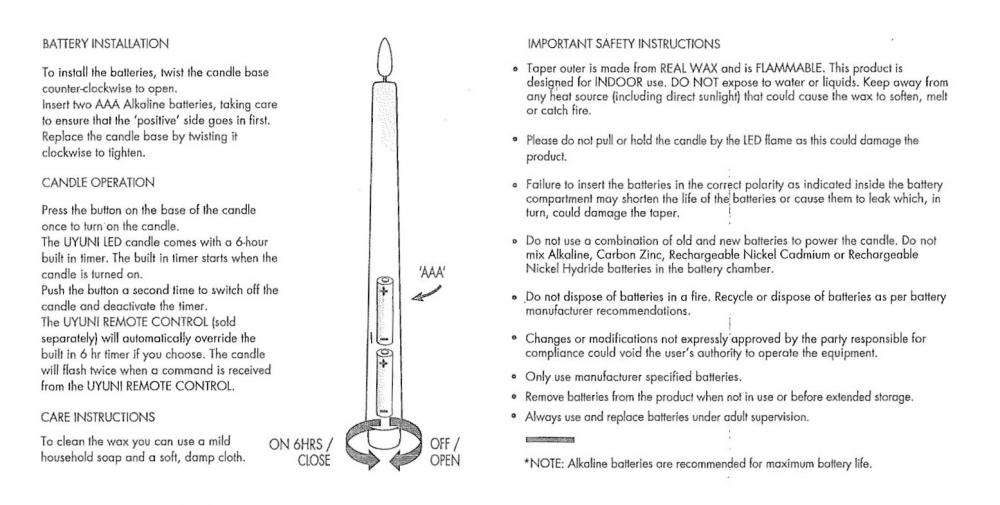 En viss variation i LED-ljusens sken kan förekomma om flera ljus används tillsammans, vilket kan bero på kvaliteten på de batterier som används och på variationer i LED-diodernas placering i 3D-flamman. Vid leverans kan ljusen vara kalla och vaxet skört; låt dem därför vila i rumstemperatur innan hantering och isättning av batterier för att undvika sprickor i vaxet.