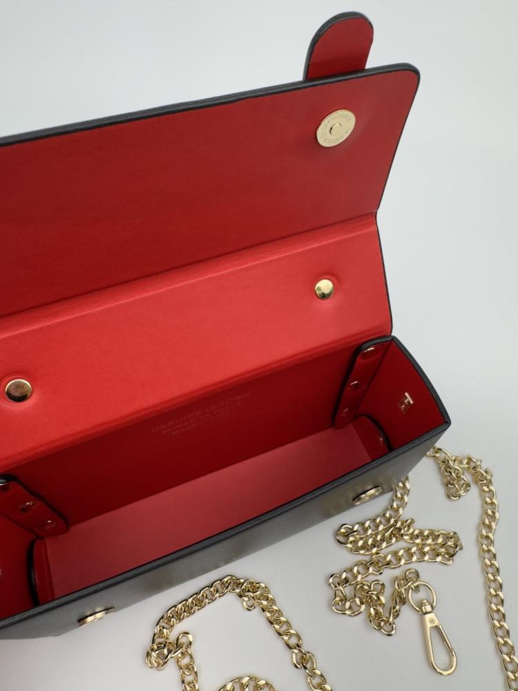 En elegant väska i äkta skinn som enkelt kan bäras både som clutch och axelväska tack vare den avtagbara guldkedjan. Insidan är klädd i en kontrasterande nyans som ger en lyxig och festlig känsla. Perfekt att bära till både vardag och fest – liten till storleken men med stor stilkänsla.