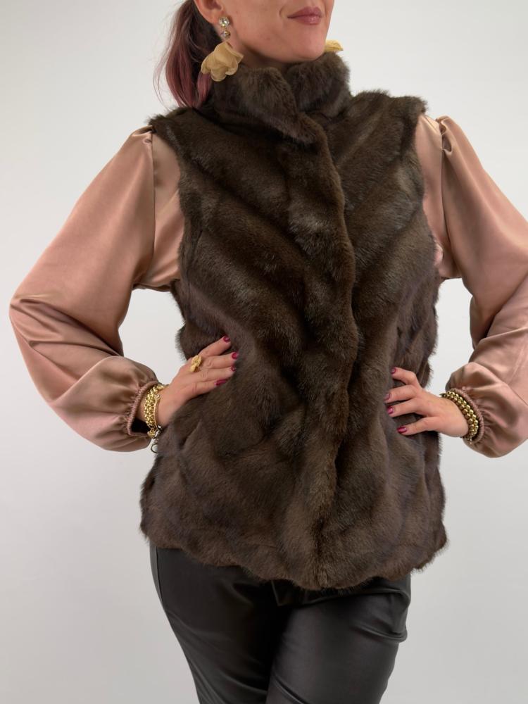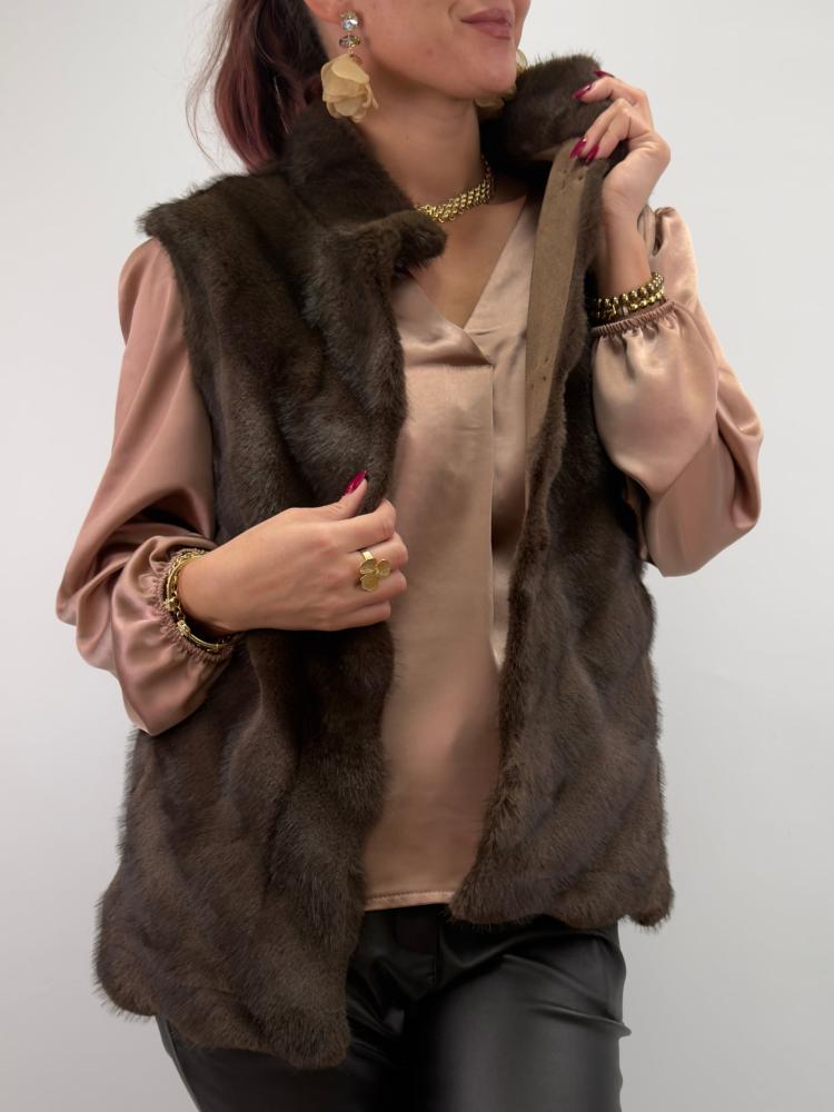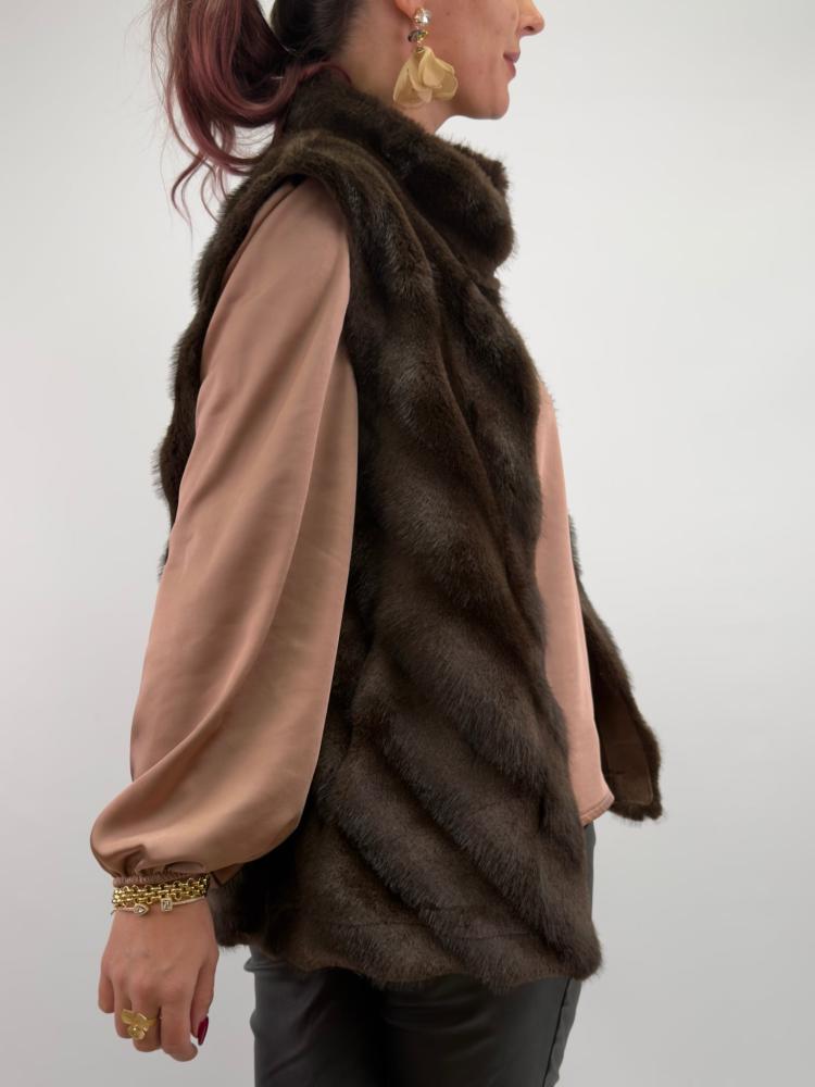 En lyxig väst i brun fuskpäls med mjuk och fyllig känsla som håller dig varm samtidigt som den adderar glamour till din outfit.