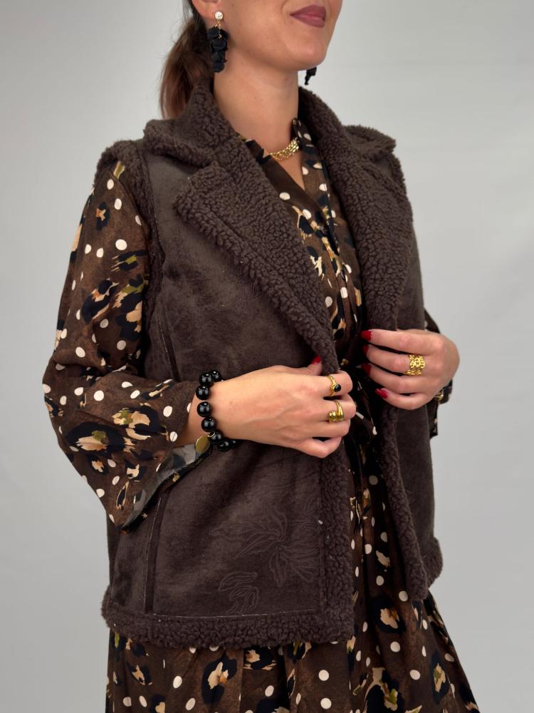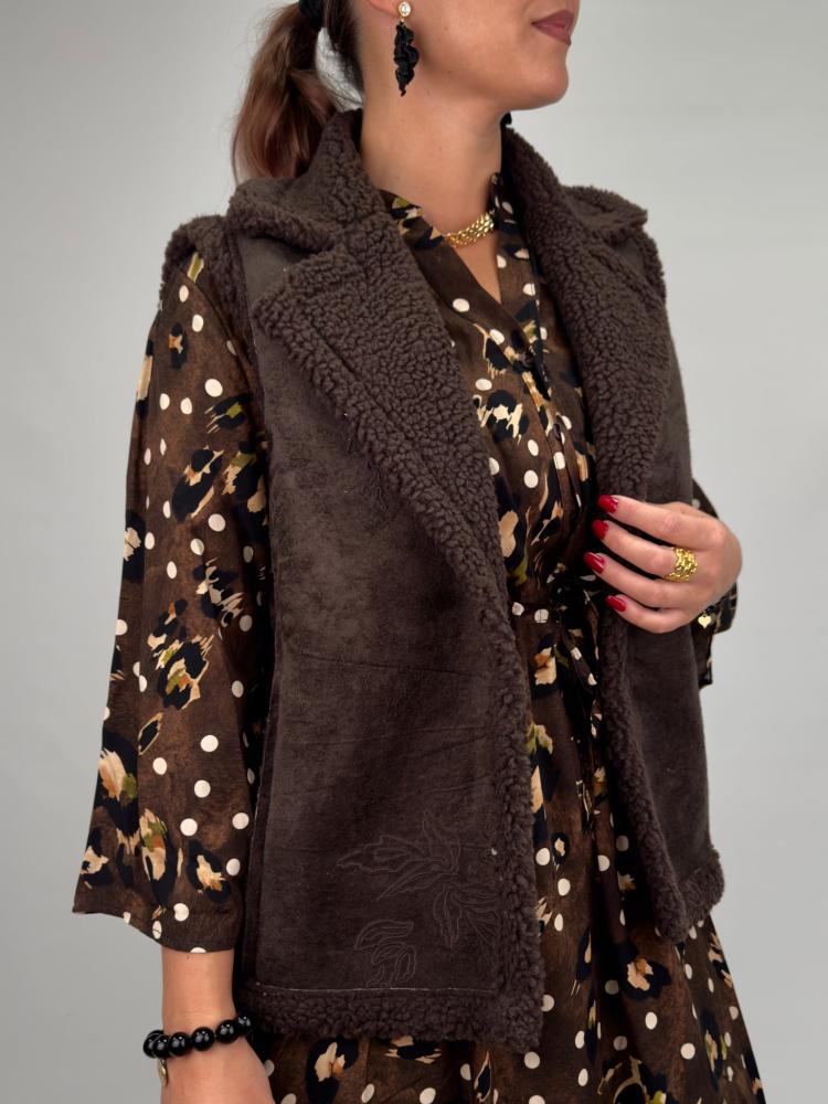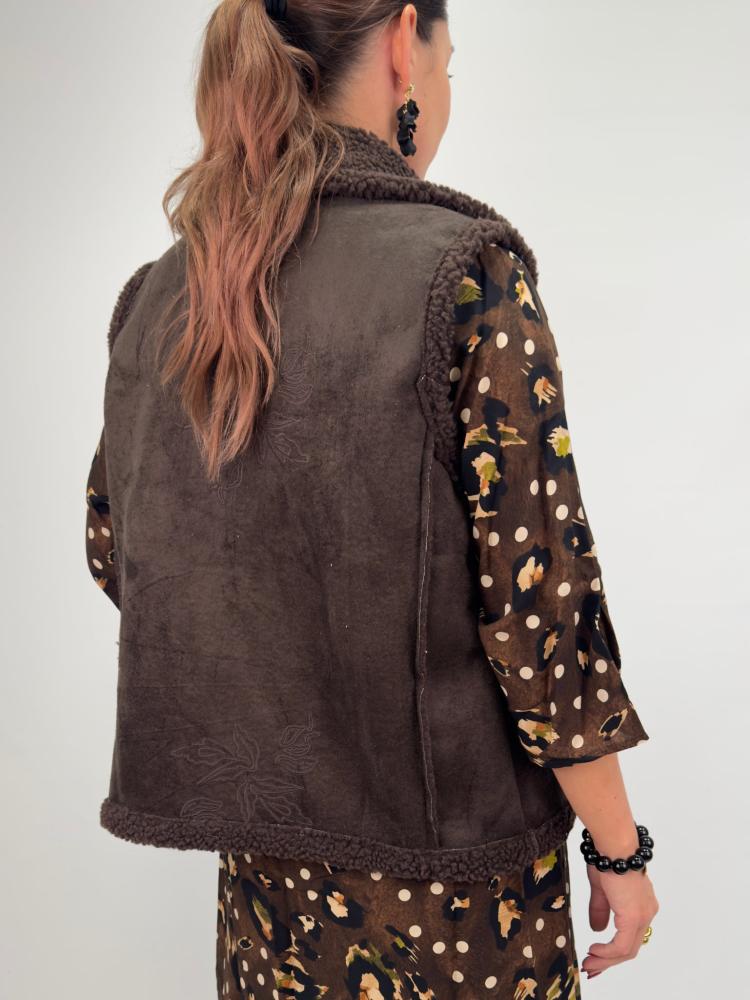 Mörkt brun väst, fuskmocka med broderi på ryggen. Ett mångsidigt plagg för skjorta såväl som klänning.