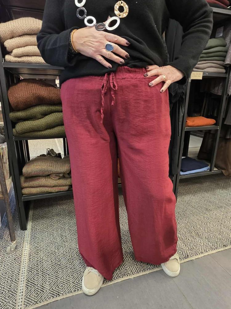 Härlig byxa i en mörkt röd / bordeaux lite grövre viskoseblandning. Bred resår med knytband och fickor