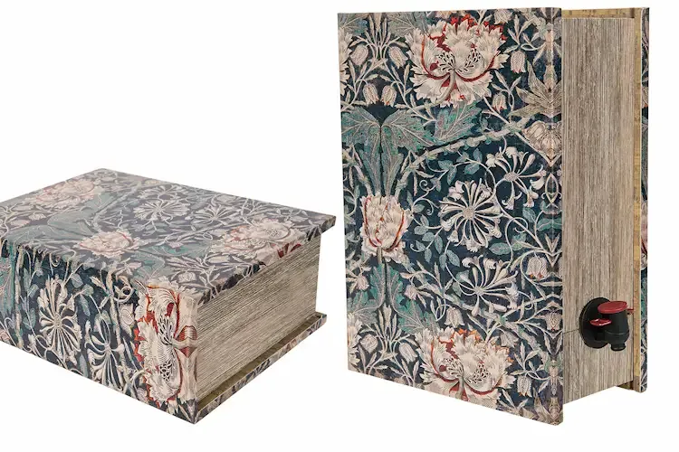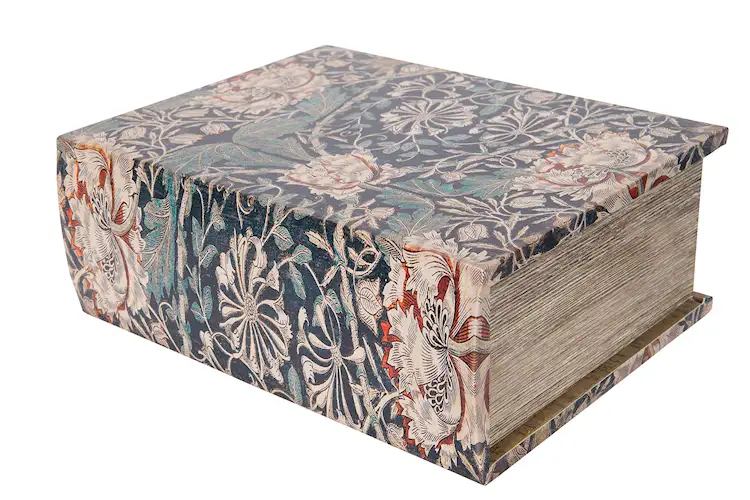 Dekorativ låda / boklåda med motiv av ett klassiskt William Morris print. Mörk botten med blommor och gröna blad. Charmig att sätta i bokhyllan - och ett trevlig sätt att "gömma" bag in boxen.