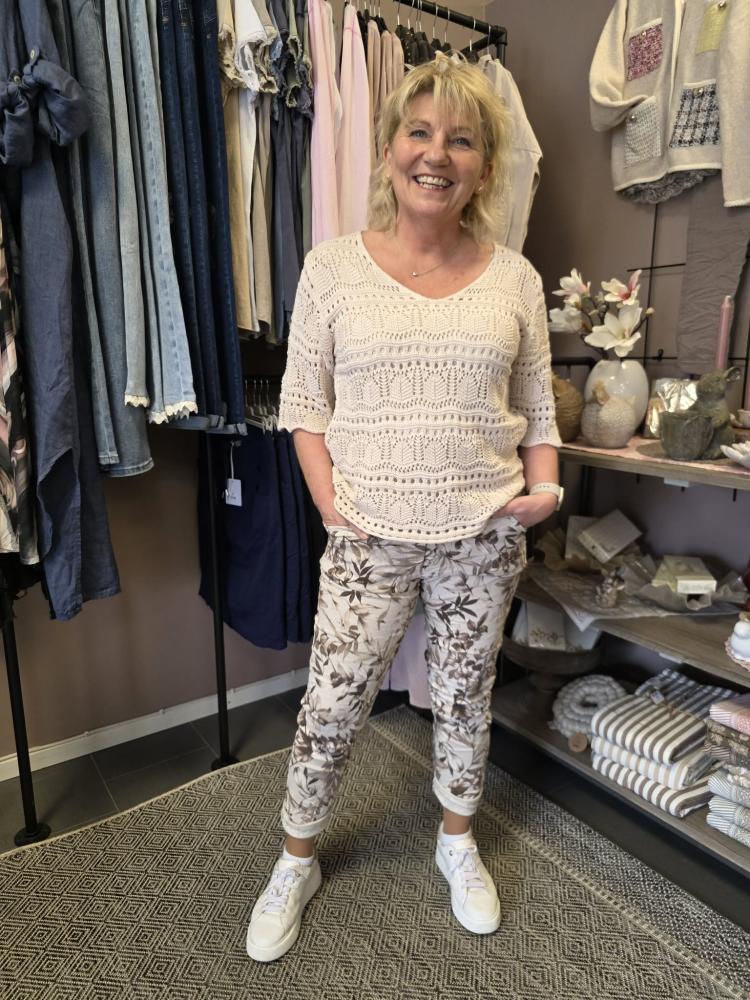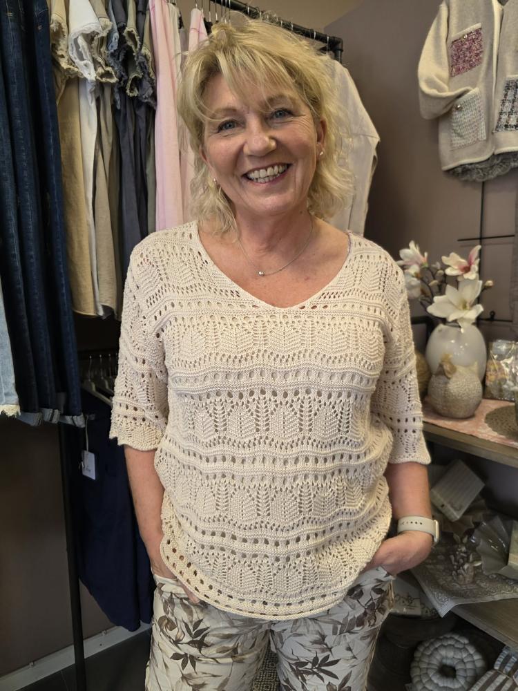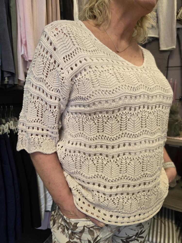 Beige / Naturfärgad v-ringad virkad topp i vackert mönster, med 3/4 ärm.