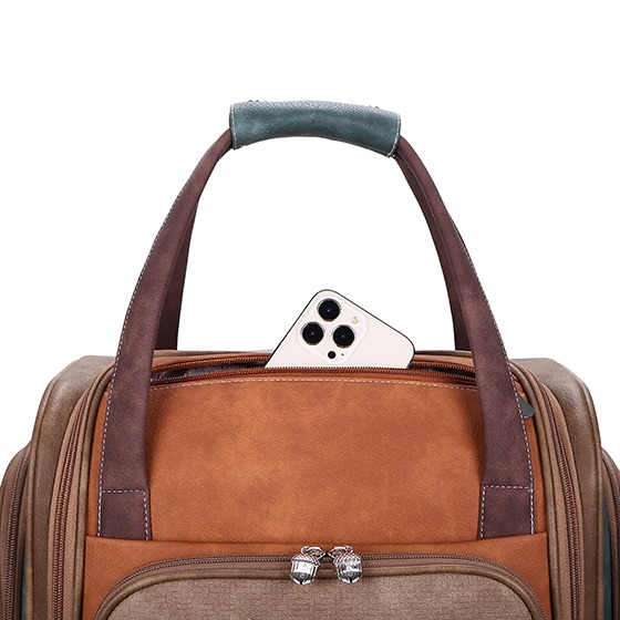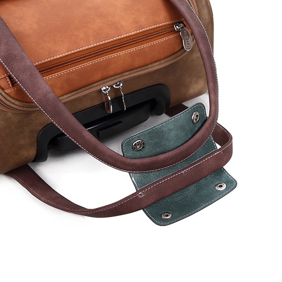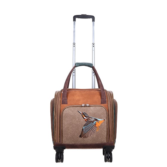 En exklusiv trolleybag i cognac och brunt med vackert broderi av en kungsfiskare, genomtänkta fack och smidig funktion. En perfekt följeslagare för dig som vill resa både praktiskt och med personlig stil.