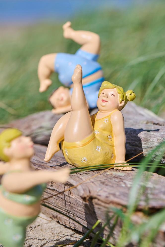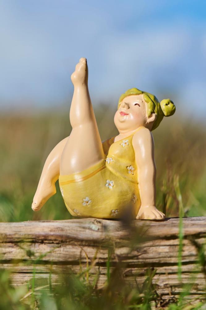 Yogadamer att bli glad av! Denna rundlätta dam sitter på golvet i en gul trikå med små vita blommor.