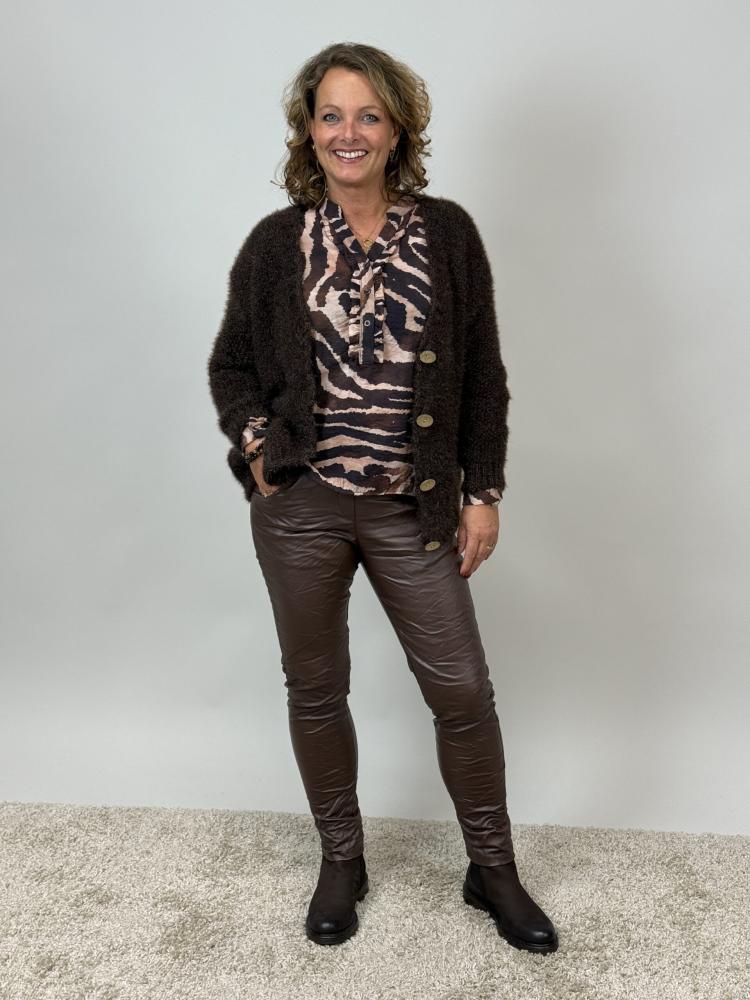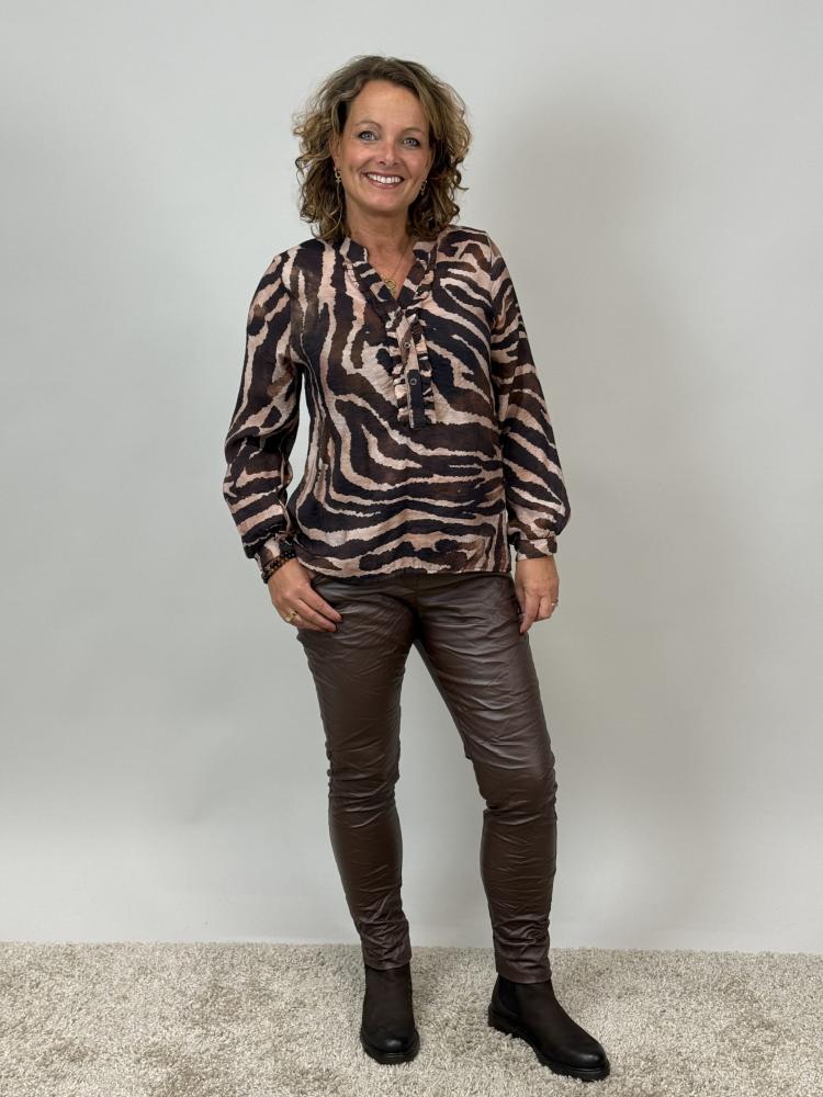 Brun och cremefärgad ebramönstrad blus i en feminin modell. Blusen är i en tunn och festlig kvalitét. V-ringad med knappar fram (ej genomknäppt) och med en liten volang fram.